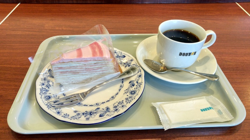肝心なのは味ですよね。一口ほおばる。じわっとほんのりとした桜味が口の中にひろがる感じです。桜味がイメージわかない方は桜餅的な味とお伝えした方がよいでしょうか。あの特有の甘く華やかな香りがじんわりと広がってくるのです。味はいわば和菓子のような感じで、でもミルクレープなので洋菓子であるといった感じで和と洋がうまく混ざり合った感じになります。この感覚がなんともエモい感じでしたね。そしてドリンクは普通のブレンドコーヒーを頼んだのですが、ドトールのコーヒーって値段の割にしっかりと苦みと酸味が共存していて、とってもおいしいなあと思うんですよね。その苦みと酸味が口一杯に広がった桜味を一度さっと忘れさせてくれ、次のミルクレープをほおばる際には再び新鮮な桜味が口一杯にじんわりと広がってくるという感じで、何度も桜味を楽しむことができました。よくある抹茶味みたいに最初だけ抹茶の味がしてあとは甘いだけというものではなく、コーヒーと組み合わせることで何度も新鮮味と春の桜味を舌で味わうことができました。