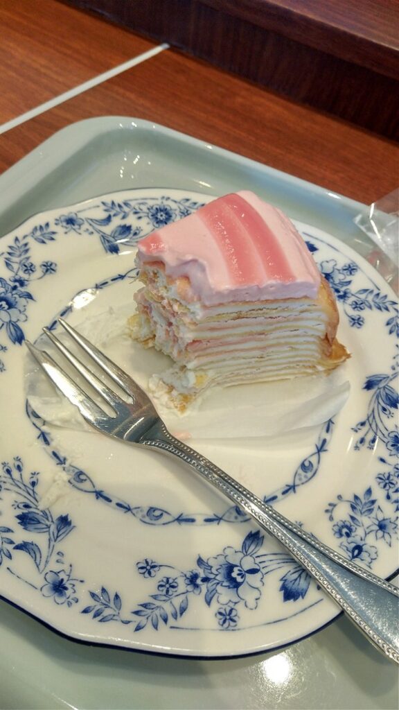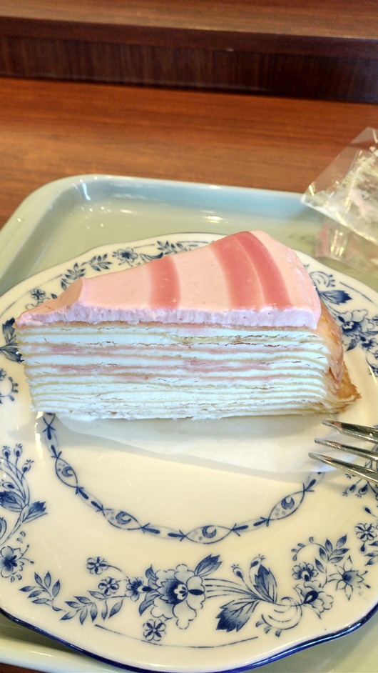 まず見た目ですが、ご存じの通りミルクレープですので、定番の形ではあります。しかしながら、上部に施されたクリームがピンク色で、かつ全体的にもピンクがかっていて、とても可愛い様相です。とても50を過ぎたオジサンが一人で注文するようなメニューではないなあと思うかもしれませんが、よくよく考えたら、仕事でピンク色のYシャツも着るし、ネクタイだってするし、まあ大丈夫かと思い、恥ずかしさはさほどございませんでした。